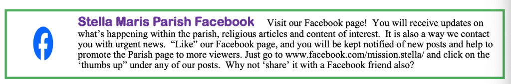 We live in an extremely mobile society, and especially here on the Sunshine Coast there are always people coming and going. If you are new to our Parish, or if you are reconnecting with the Church, we would love to welcome you more formally to our Parish Family. You will find “welcome packs” at the entrance of our churches, and if you complete and return the forms we will be in contact with you. Once again, welcome.